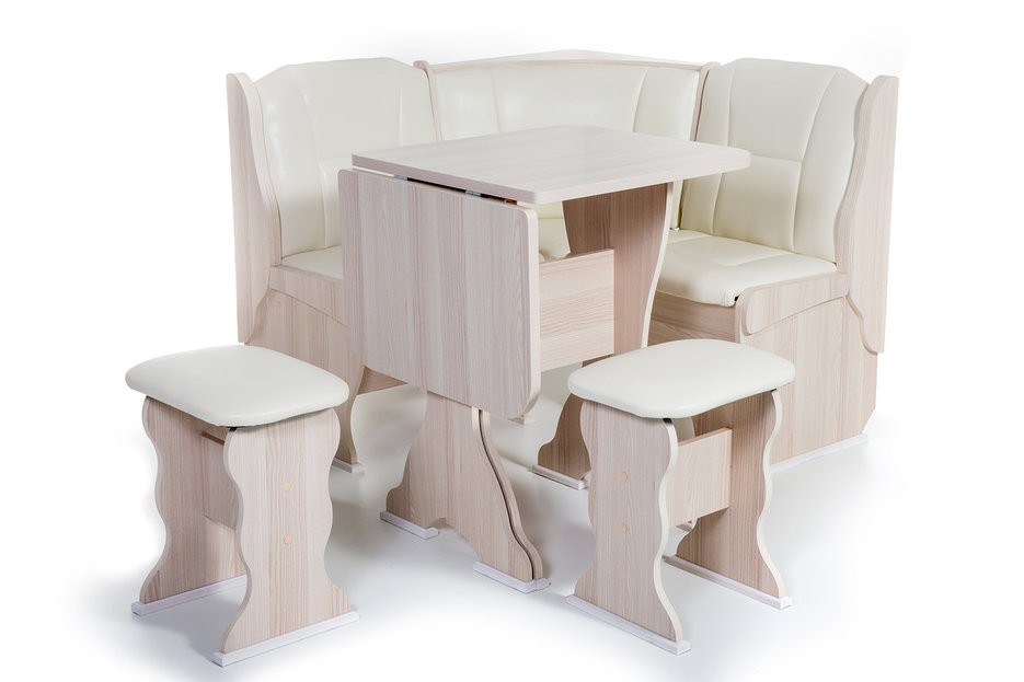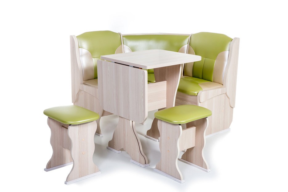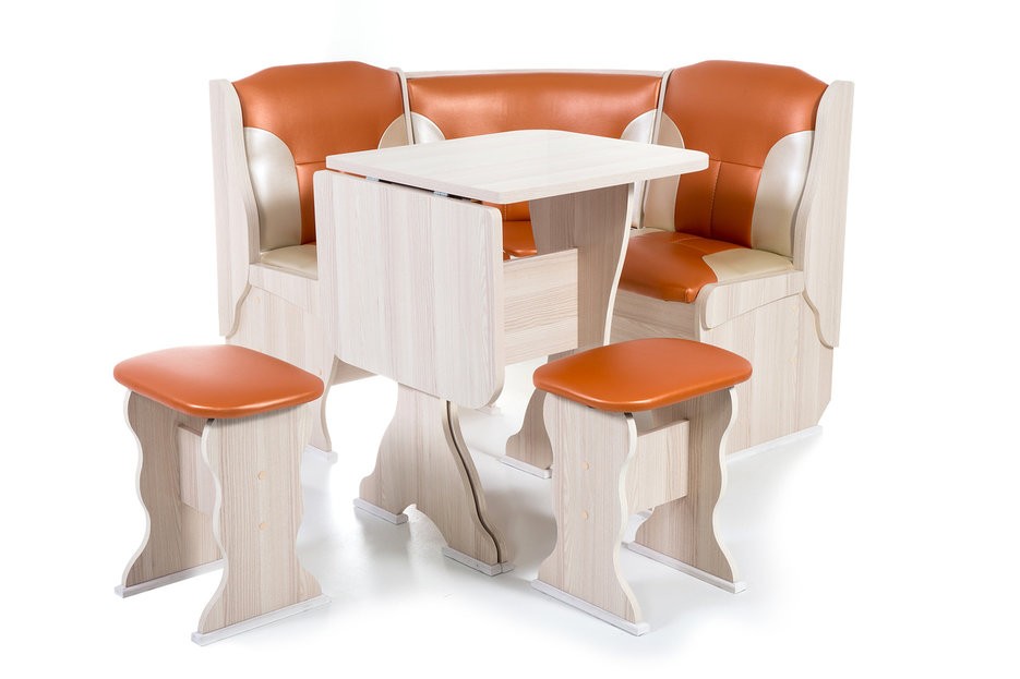 Особенности уголка: Поможет обустроить комфортную обеденную зону без лишних затрат. В гарнитур входит угловой диван, два табурета и раскладной стол. В угловой части дивана есть удобная полочка, на которую можно поставить нужные вещи. Под сидениями находятся вместительные ящики для хранения. Имеет термостойкую пластиковую столешницу. Угол собирается как в правом, так и в левом исполнении. Размеры: Размер угловой скамьи: ш(1080х1080)хг530хв880 мм. Размер стола: ш625(1000)хг580хв750 мм. Размер табурета: ш380хг300хв450 мм. Высота уголка: 880 мм. Высота посадки скамьи: 465 мм. Высота табурета: 450 мм. Высота стола: 750 мм.
