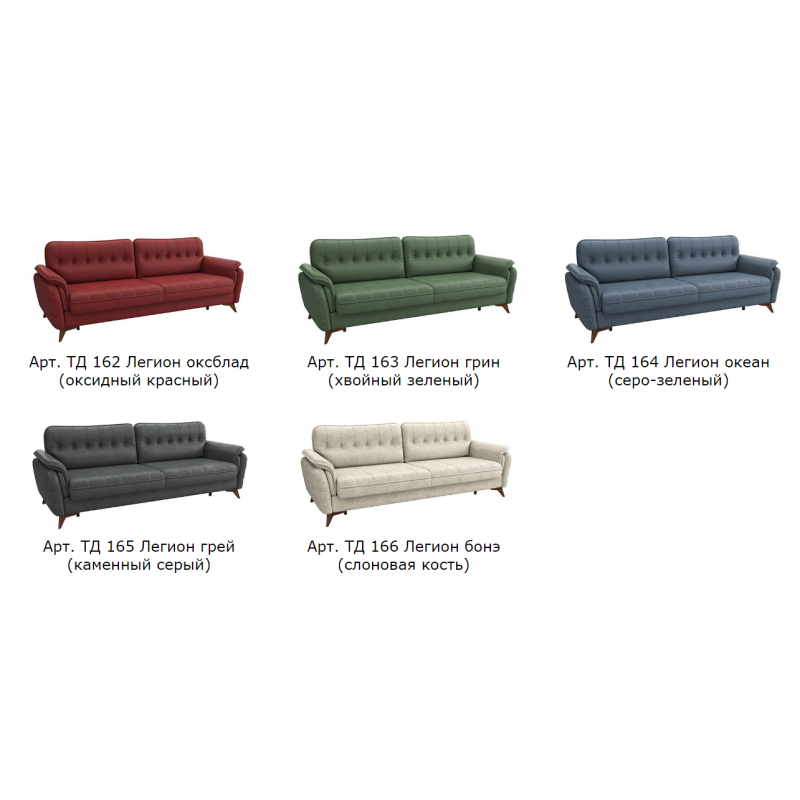 • Основная ткань: Легион (иск. замша). Мягкая мебельная замша с модной фактурой и легким ворсовым эффектом. Природные цвета коллекции подчеркивают ее сходство с натуральным аналогом. Не подвержена образованию заминов в условиях повседневной и интенсивной эксплуатации. Хорошо держит форму, не вытягивается, долго сохраняет первоначальный эстетичный вид. Экологичность и высокие эксплуатационные характеристики микрозамши достигаются благодаря использованию инновационных технологий при производстве. Коллекция имеет международный сертификат качества. Плотность ткани: 310 г/кв.м. Количество циклов истирания: более 25 000.