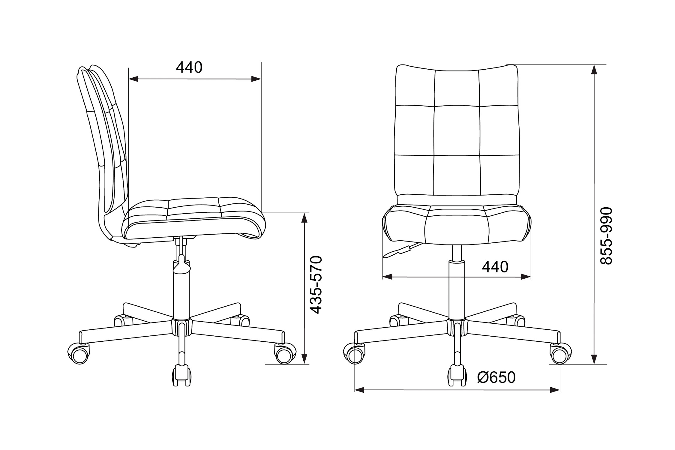 Диаметр колес - 5 см. Высота сиденья - 57 см. Ширина сиденья - 44 см. Глубина сиденья - 44 см. Материал колес с накладкой PU. Крестовина металлическая разборная, крашеная под хром.